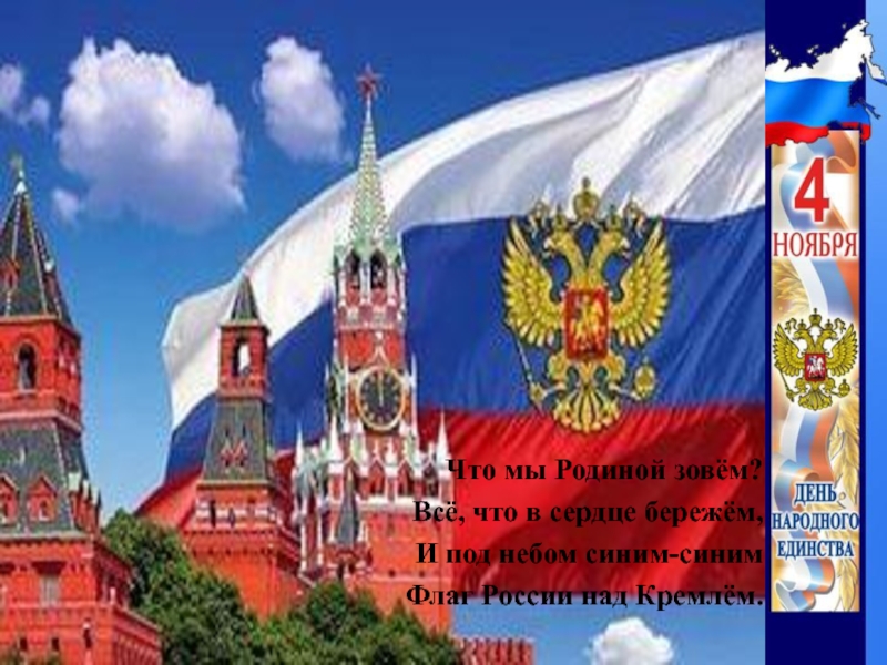 Что мы Родиной зовём?Всё, что в сердце бережём,И под небом синим-синимФлаг России над Кремлём.