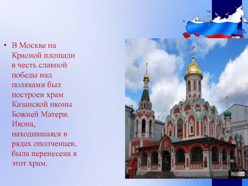 В Москве на Красной площади в честь славной победы над поляками был построен храм Казанской иконы Божией
