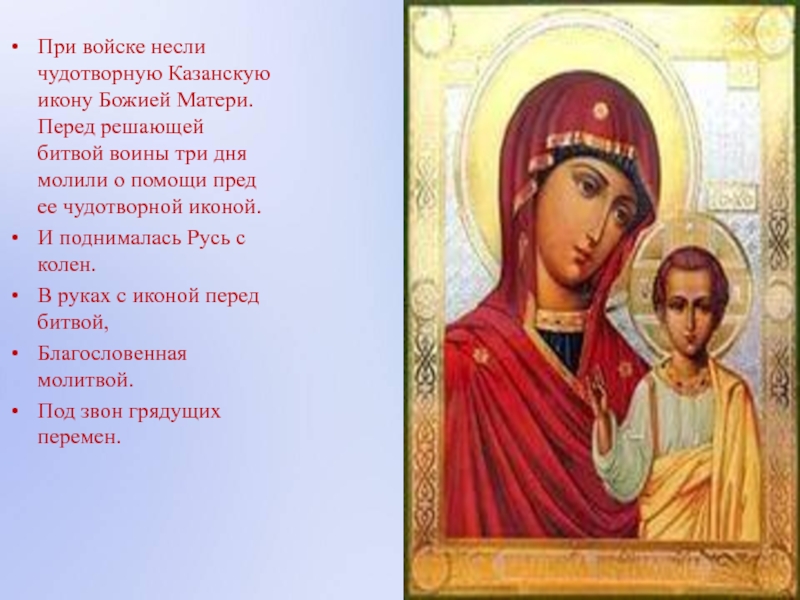 Слайд 14При войске несли чудотворную Казанскую икону Божией Матери. Перед решающей битвой