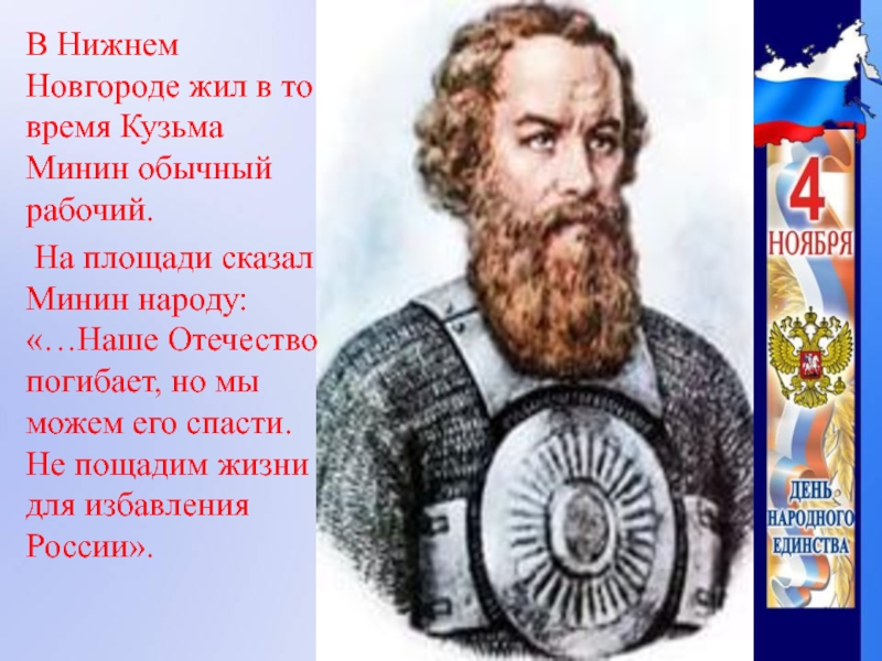 В Нижнем Новгороде жил в то время Кузьма Минин обычный рабочий.