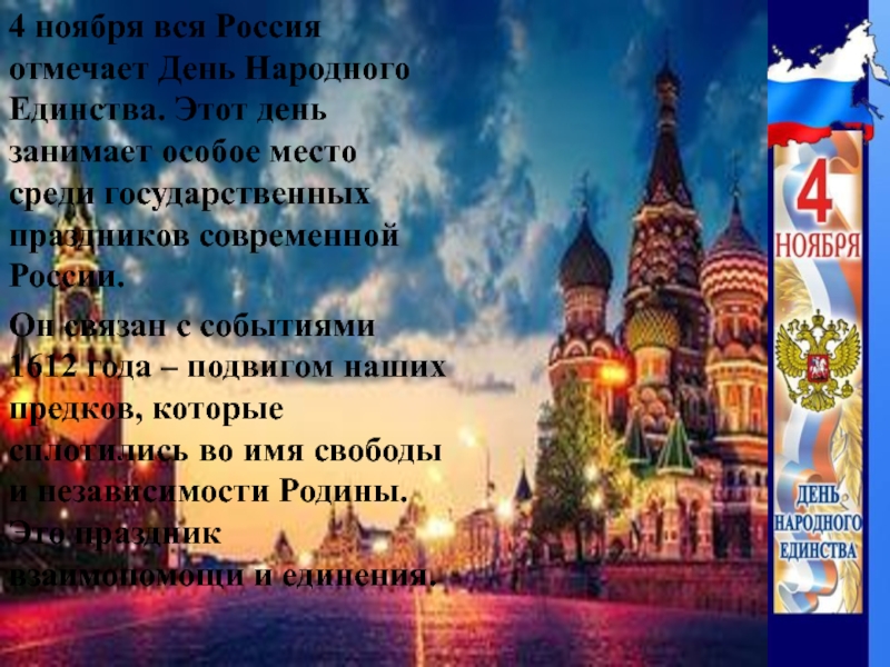 4 ноября вся Россия отмечает День Народного Единства. Этот день занимает