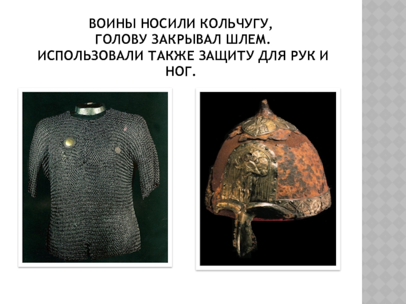 Слайд 20Воины носили кольчугу, Голову закрывал шлем. Использовали также защиту для рук