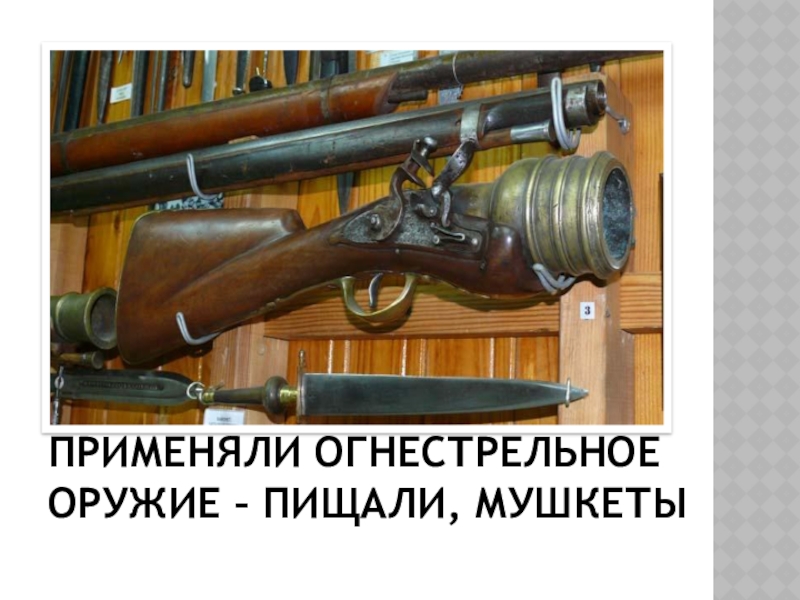 Слайд 21Применяли огнестрельное оружие – пищали, мушкеты