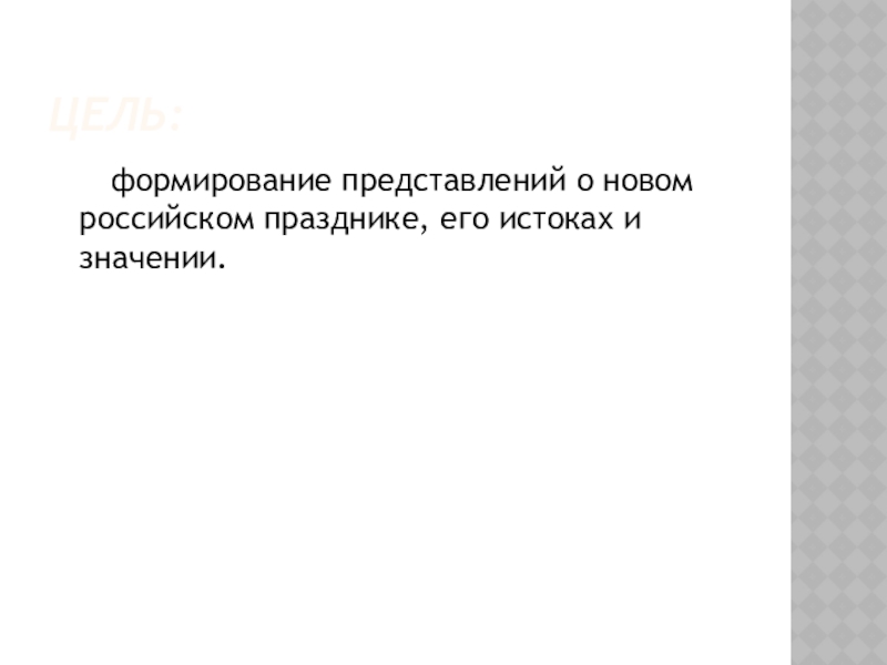 Цель: формирование представлений о новом российском празднике, его истоках и значении.