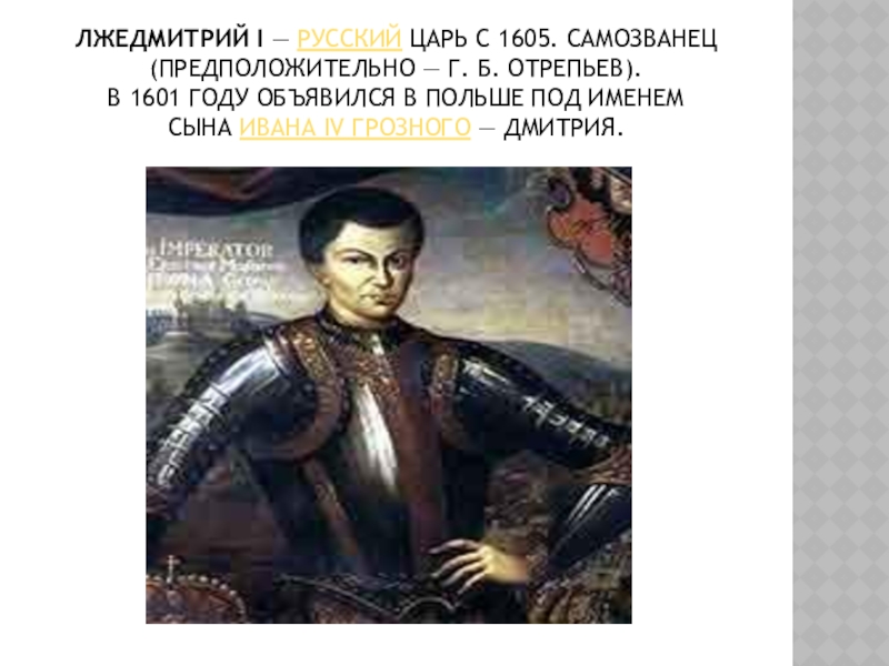 Слайд 10Лжедмитрий I — русский царь с 1605. Самозванец (предположительно — Г. Б. Отрепьев). В