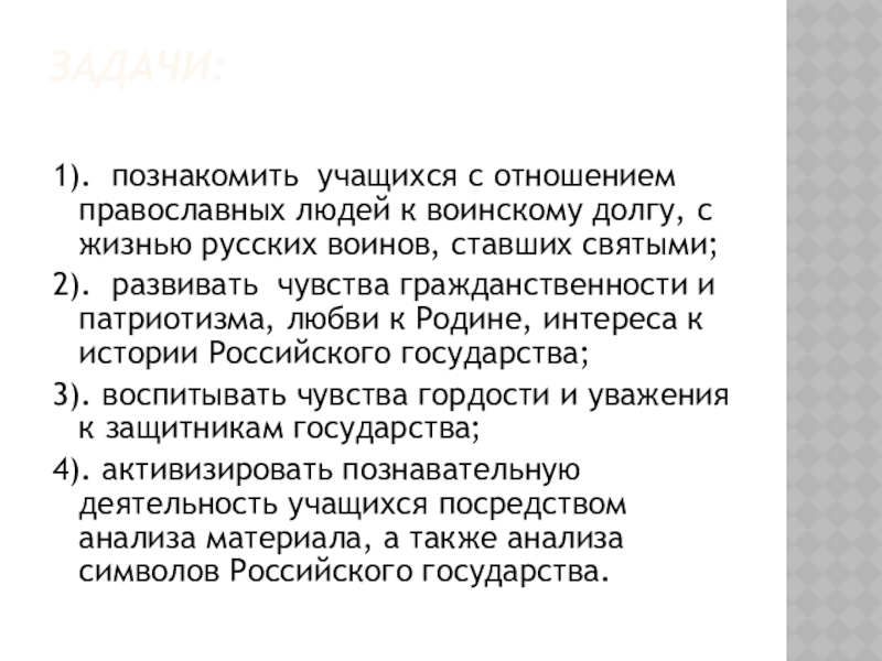 Задачи: 1). познакомить учащихся с отношением православных людей к воинскому долгу, с жизнью русских воинов, ставших святыми;2).