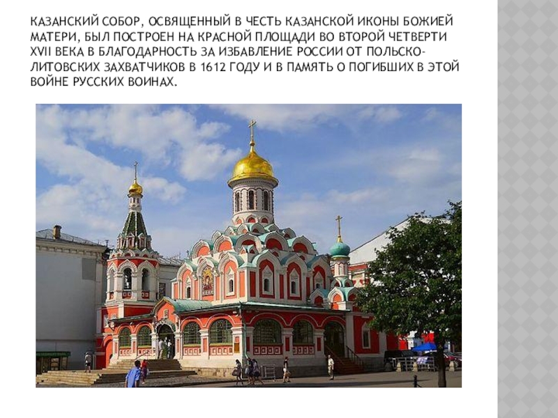 Казанский собор, освященный в честь Казанской иконы Божией Матери, был построен на Красной площади во второй четверти