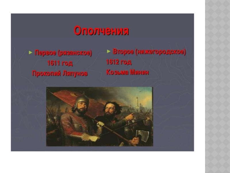 1.   Кто возглавил первое ополчение 1611 года?