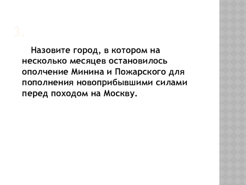 3.   Назовите город, в котором на несколько месяцев остановилось ополчение Минина и Пожарского для пополнения