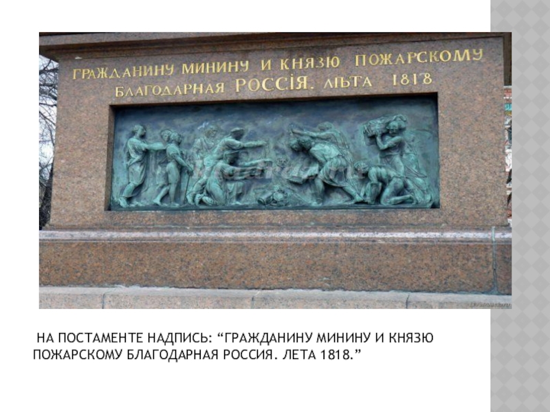 На постаменте надпись: “Гражданину Минину и князю Пожарскому благодарная Россия. Лета 1818.”