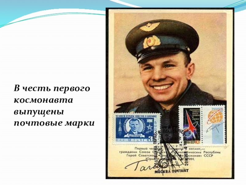 Слайд 7В честь первого космонавта выпущены почтовые марки