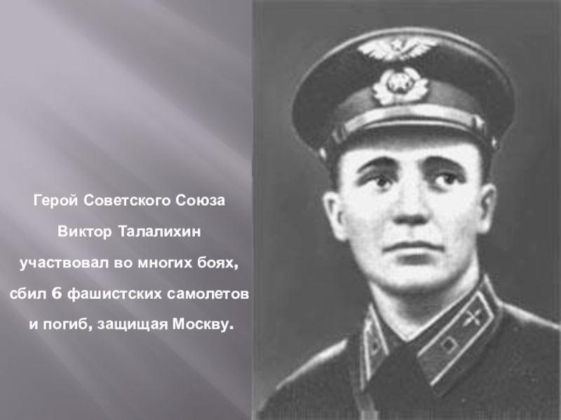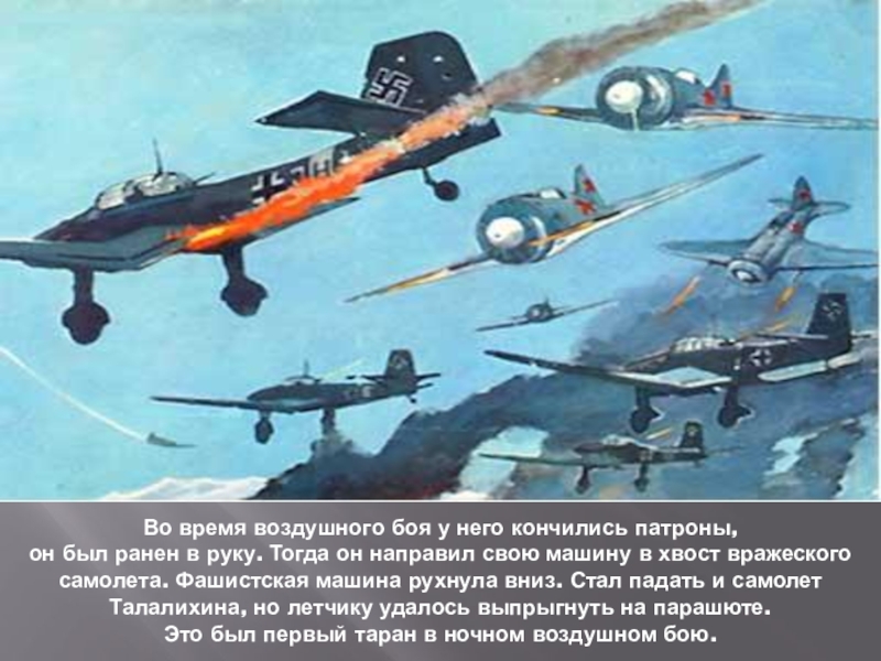 он был ранен в руку. Тогда он направил свою машину в хвост вражеского самолета. Фашистская машина рухнула вниз. Стал падать и самолет Талалихина, но летчику удалось выпрыгнуть на парашюте. Это был первый таран в ночном воздушном бою.