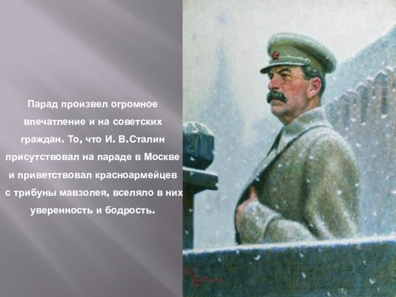 Слайд 16Парад произвел огромное впечатление и на советских граждан. То, что И. В.Сталин присутствовал на параде