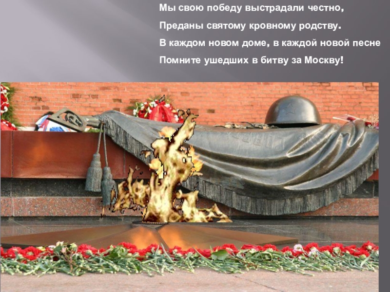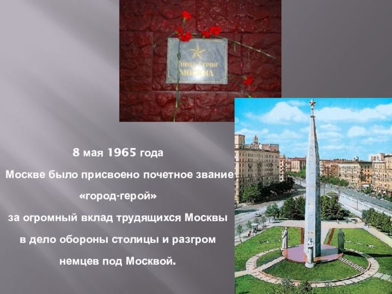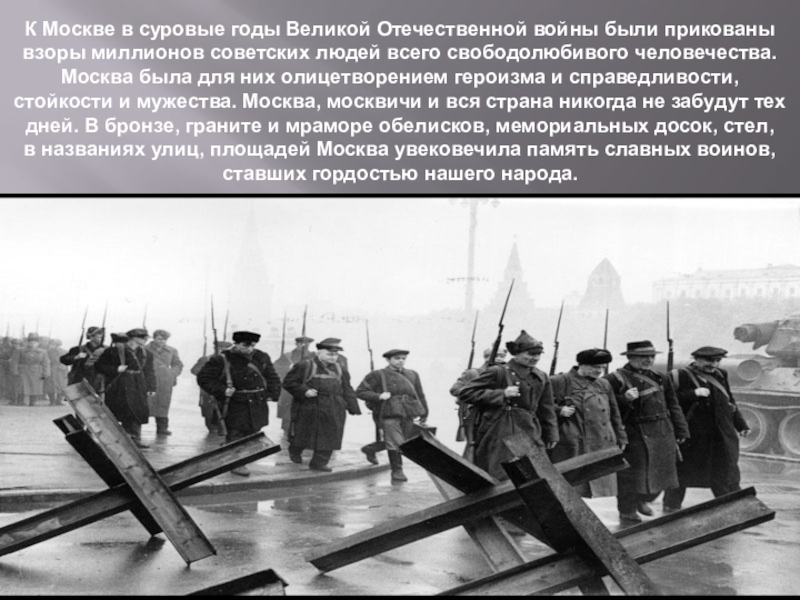 советских людей всего свободолюбивого человечества. Москва была для них олицетворением героизма и справедливости, стойкости и мужества. Москва, москвичи и вся страна никогда не забудут тех дней. В бронзе, граните и мраморе обелисков, мемориальных досок, стел, в названиях улиц, площадей Москва увековечила память славных воинов, ставших гордостью нашего народа.