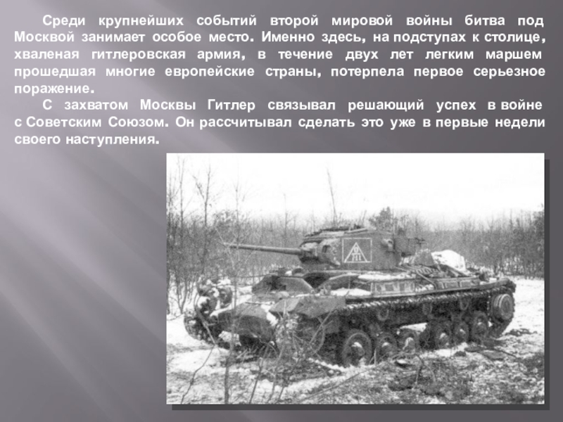 Слайд 3 Среди крупнейших событий второй мировой войны битва под Москвой занимает особое