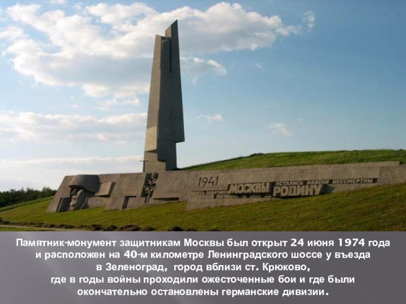 Слайд 35Памятник-монумент защитникам Москвы был открыт 24 июня 1974 года