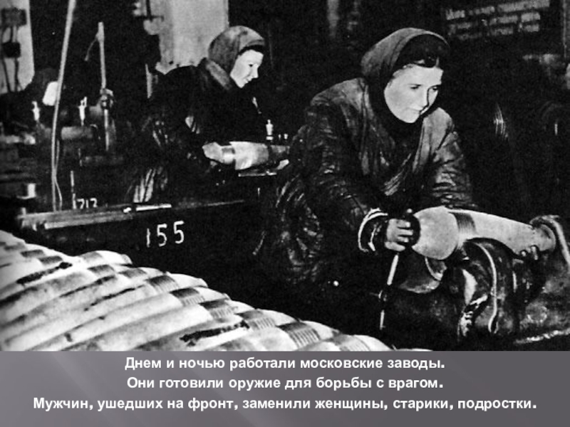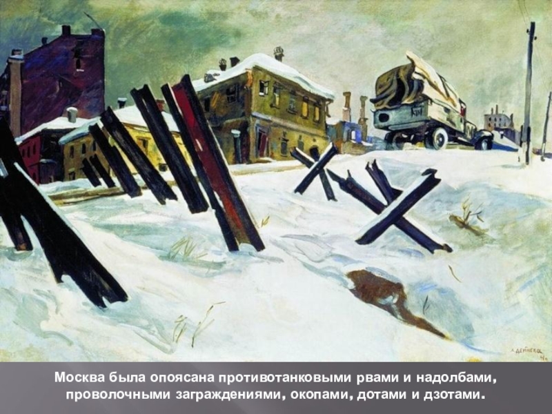 Слайд 14Москва была опоясана противотанковыми рвами и надолбами, проволочными заграждениями, окопами, дотами