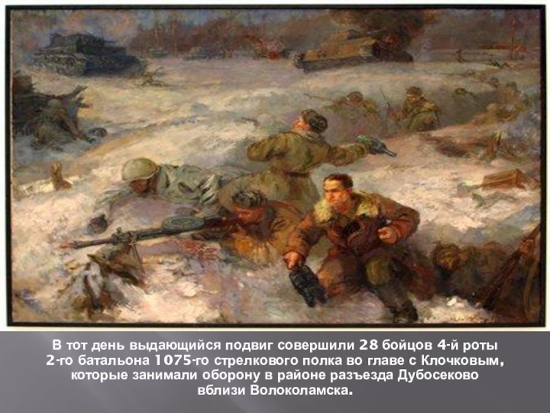 2-го батальона 1075-го стрелкового полка во главе с Клочковым, которые занимали оборону в районе разъезда Дубосеково вблизи Волоколамска.