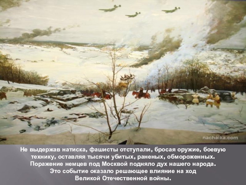 технику, оставляя тысячи убитых, раненых, обмороженных. Поражение немцев под Москвой подняло дух нашего народа. Это событие оказало решающее влияние на ход Великой Отечественной войны.