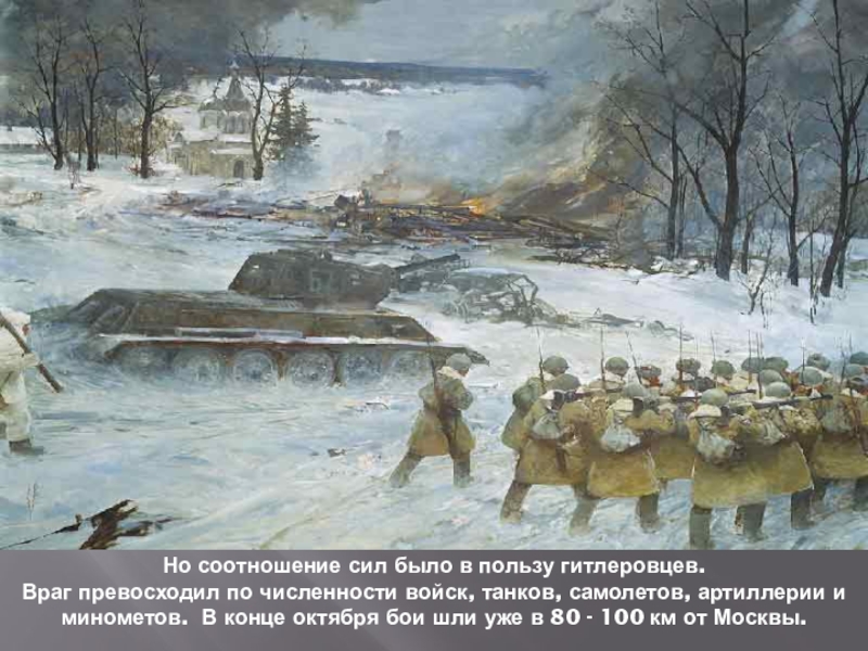Враг превосходил по численности войск, танков, самолетов, артиллерии и минометов. В конце октября бои шли уже в 80 - 100 км от Москвы.
