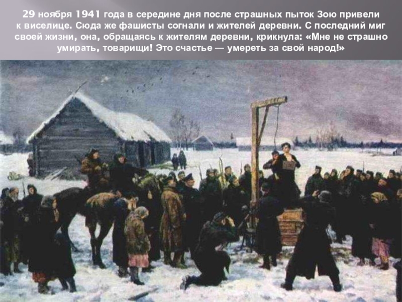 Слайд 3429 ноября 1941 года в середине дня после страшных пыток Зою привели к виселице. Сюда же