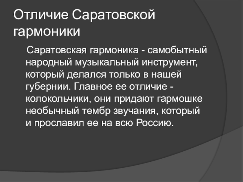 Отличие Саратовской гармоники  Саратовская гармоника - самобытный народный музыкальный инструмент, который делался только в нашей губернии.