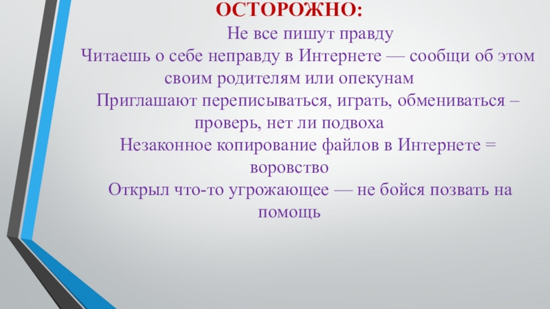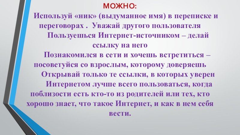 и не оскорбляй сам других пользователей. Будь осторожен с новыми знакомыми. В Сети ты можешь встретить все, что угодно – от уроков истории и новостей до нелепых картинок. Но не стоит думать, что, раз информация появилась в Интернете, она является достоверной.