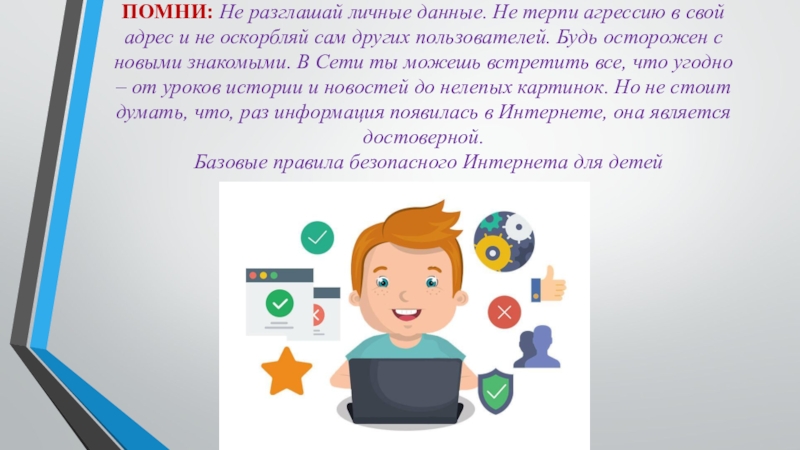 Слайд 11ПОМНИ: Не разглашай личные данные. Не терпи агрессию в свой адрес