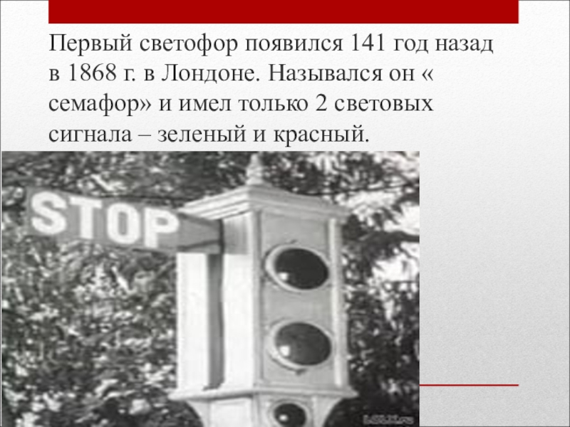 Слайд 4 Первый светофор появился 141 год назад в 1868 г. в Лондоне.