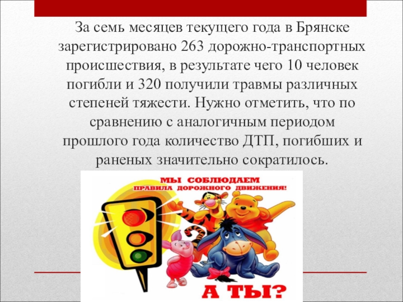 Слайд 2За семь месяцев текущего года в Брянске зарегистрировано 263 дорожно-транспортных происшествия,