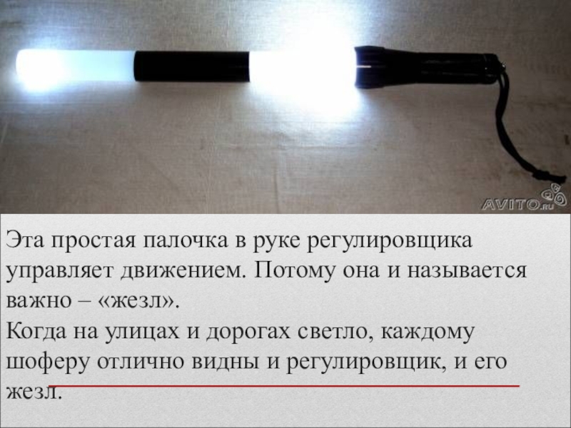 Слайд 8Эта простая палочка в руке регулировщика управляет движением. Потому она и