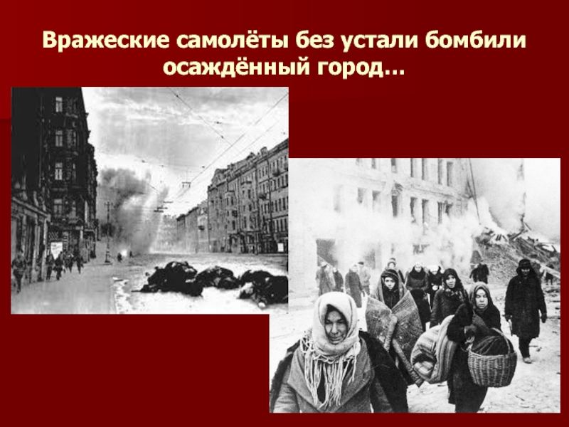 Слайд 3Вражеские самолёты без устали бомбили осаждённый город…