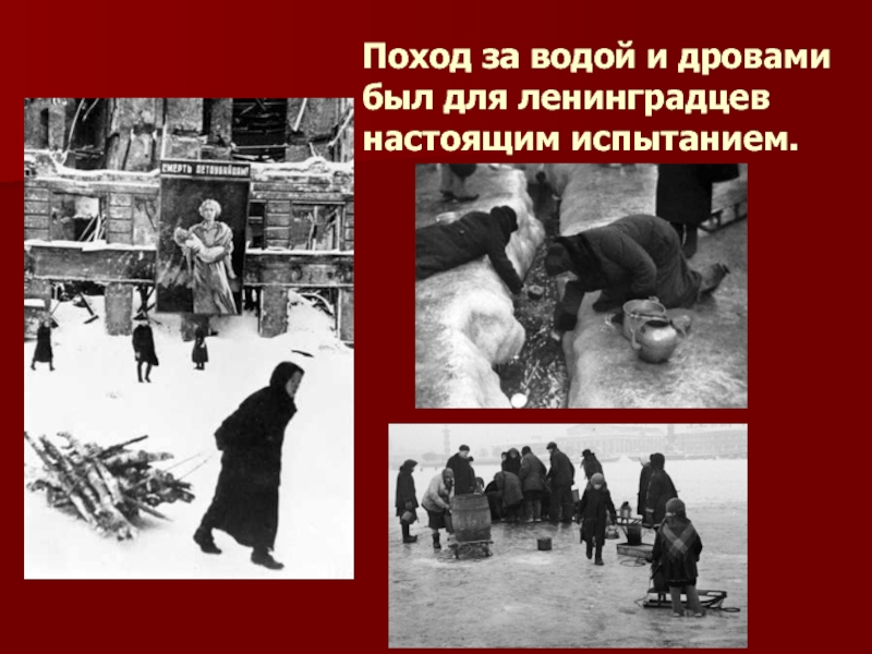 Слайд 7Поход за водой и дровами был для ленинградцев настоящим испытанием.