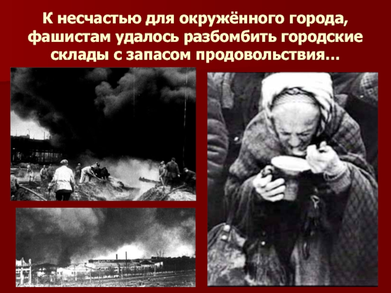Слайд 6К несчастью для окружённого города, фашистам удалось разбомбить городские склады с