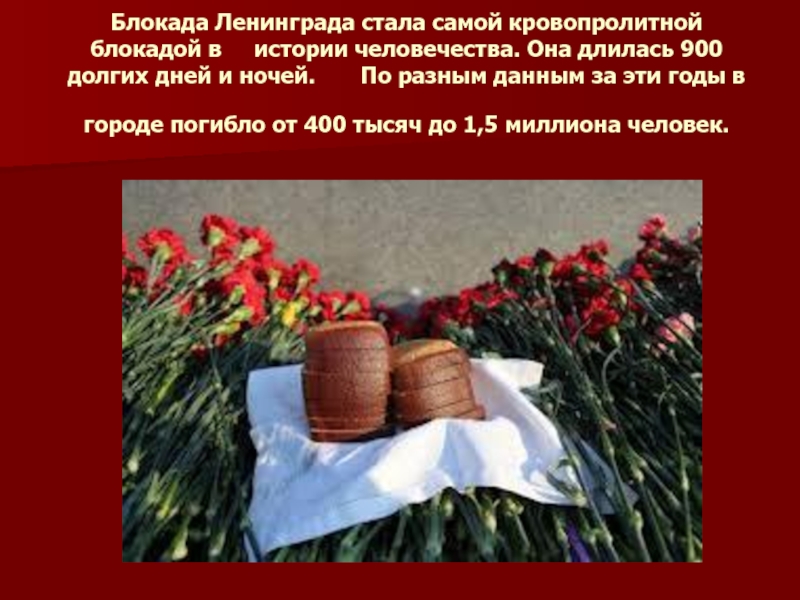 Блокада Ленинграда стала самой кровопролитной блокадой в   истории человечества. Она длилась 900 долгих дней и