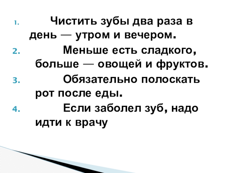 Чистить зубы два раза в день — утром и вечером.        Меньше есть сладкого,