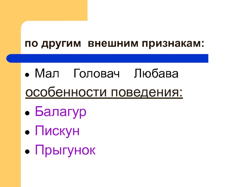 по другим внешним признакам:Мал  Головач  Любаваособенности поведения:БалагурПискунПрыгунок