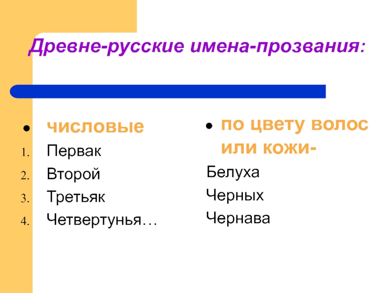 Древне-русские имена-прозвания: числовыеПервакВторойТретьякЧетвертунья…по цвету волос или кожи-БелухаЧерныхЧернава