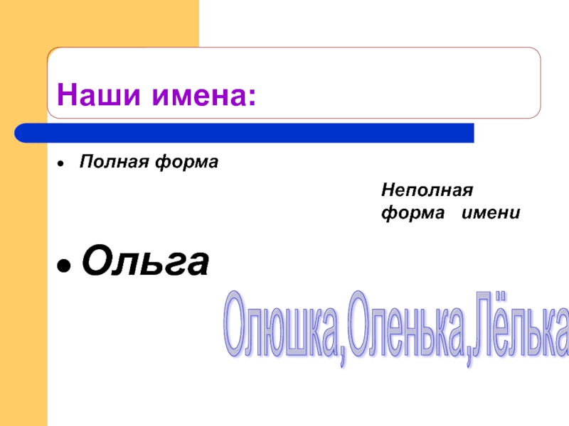 Наши имена:Полная форма           Ольга Олюшка,Оленька,Лёлька Неполная форма
