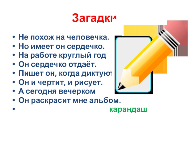 Загадки Не похож на человечка.Но имеет он сердечко.На работе круглый годОн сердечко отдаёт.Пишет он, когда диктуют,Он и