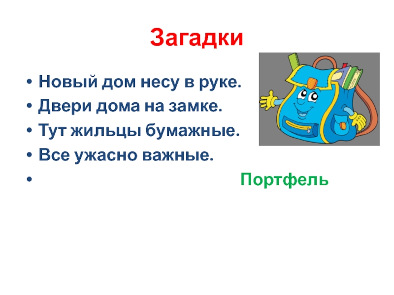 Загадки Новый дом несу в руке.Двери дома на замке.Тут жильцы бумажные.Все ужасно важные.