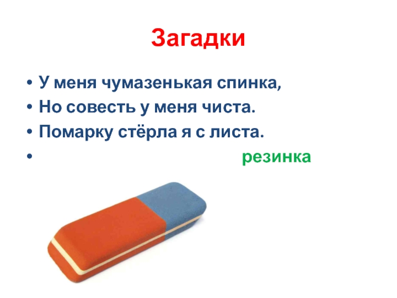 Загадки У меня чумазенькая спинка,Но совесть у меня чиста.Помарку стёрла я с листа.
