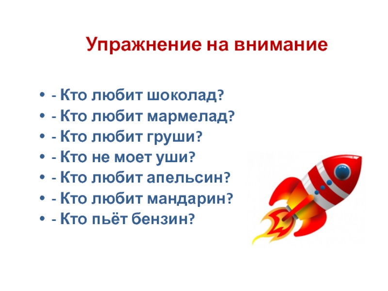 Упражнение на внимание- Кто любит шоколад?- Кто любит мармелад?- Кто любит груши?- Кто не моет уши?- Кто