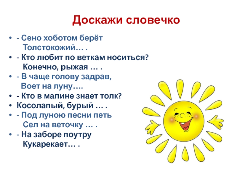 Доскажи словечко- Сено хоботом берёт     Толстокожий… .- Кто любит по веткам носиться?