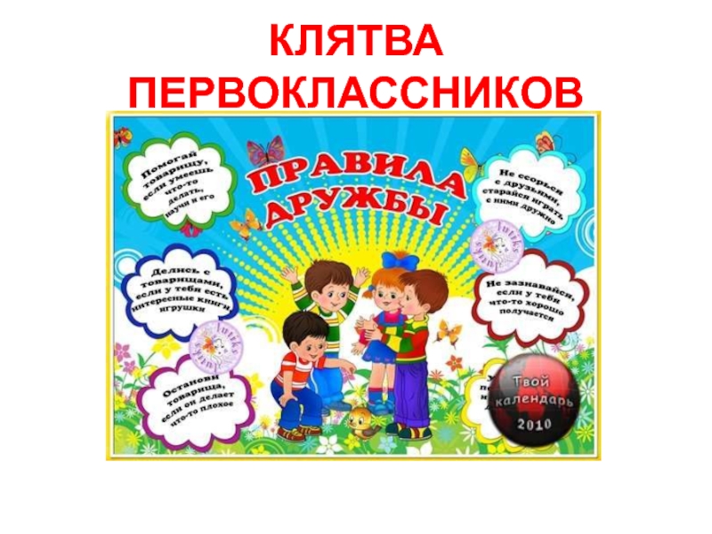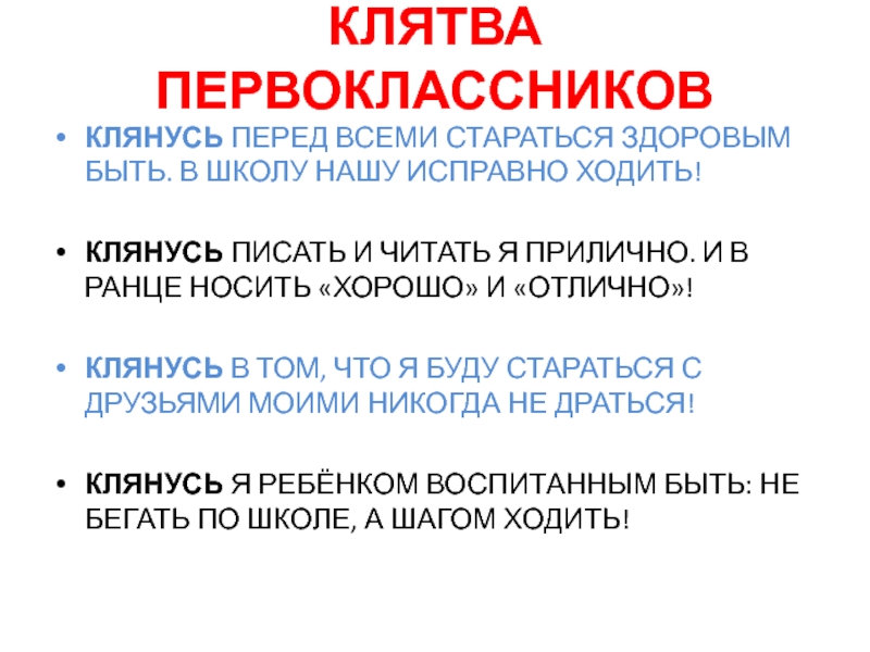 КЛЯТВА ПЕРВОКЛАССНИКОВКЛЯНУСЬ ПЕРЕД ВСЕМИ СТАРАТЬСЯ ЗДОРОВЫМ БЫТЬ. В ШКОЛУ НАШУ ИСПРАВНО ХОДИТЬ!КЛЯНУСЬ ПИСАТЬ И ЧИТАТЬ Я ПРИЛИЧНО.