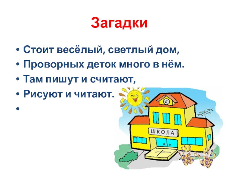 Загадки Стоит весёлый, светлый дом,Проворных деток много в нём.Там пишут и считают,Рисуют и читают.