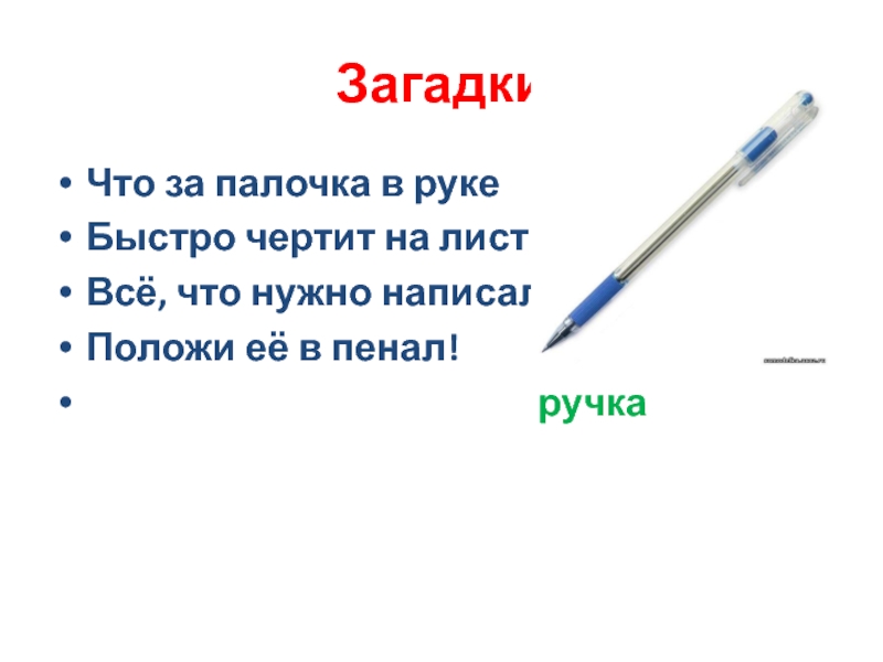 Загадки Что за палочка в рукеБыстро чертит на листке?Всё, что нужно написал?Положи её в пенал!