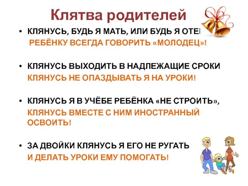 Клятва родителейКЛЯНУСЬ, БУДЬ Я МАТЬ, ИЛИ БУДЬ Я ОТЕЦ   РЕБЁНКУ ВСЕГДА ГОВОРИТЬ «МОЛОДЕЦ»!КЛЯНУСЬ ВЫХОДИТЬ В