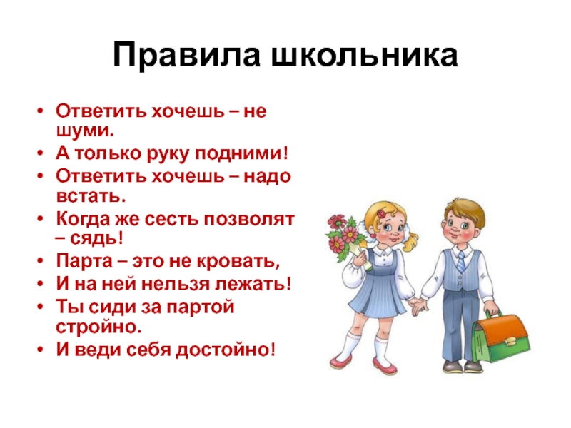 Правила школьникаОтветить хочешь – не шуми.А только руку подними!Ответить хочешь – надо встать.Когда же сесть позволят – сядь!Парта – это не кровать,И на ней нельзя лежать!Ты сиди за партой стройно.И веди себя достойно!