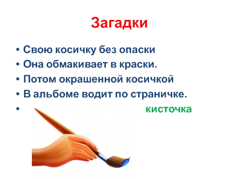 Загадки Свою косичку без опаскиОна обмакивает в краски.Потом окрашенной косичкойВ альбоме водит по страничке.